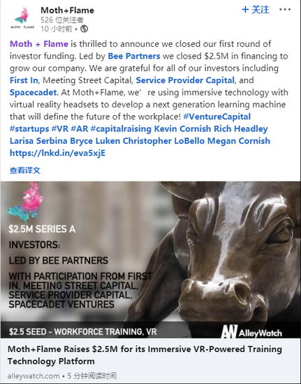 6月23日,虚拟现实(VR)培训技术开发商Moth+Flame正式宣布,公司刚刚完成了250万美元的种子轮融资,本轮融资由Bee Partners领投,First In、Meeting Street Capital、Service Provider Capital、Spacecadet和电影《头号玩家》的制片人Dan Farah追加投资。